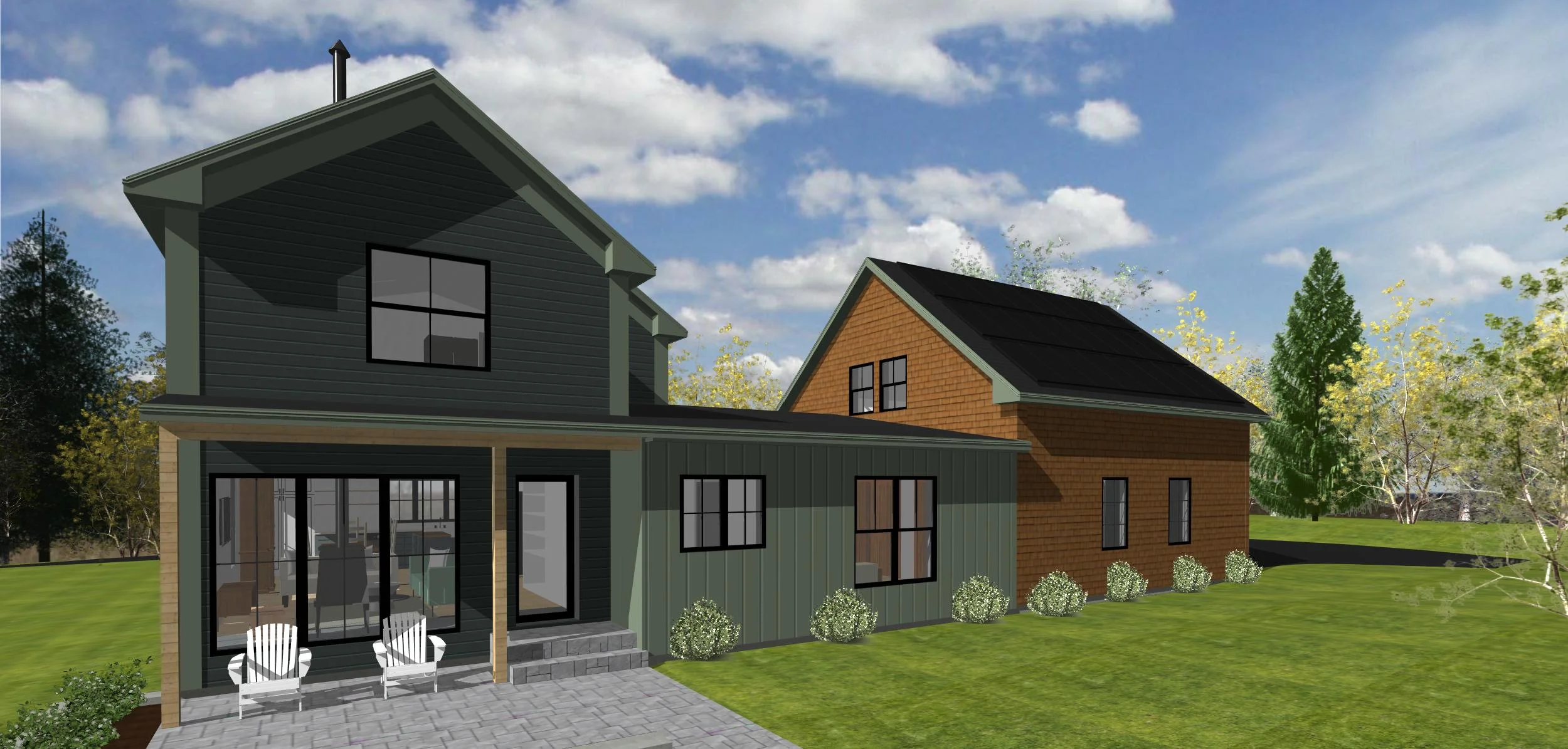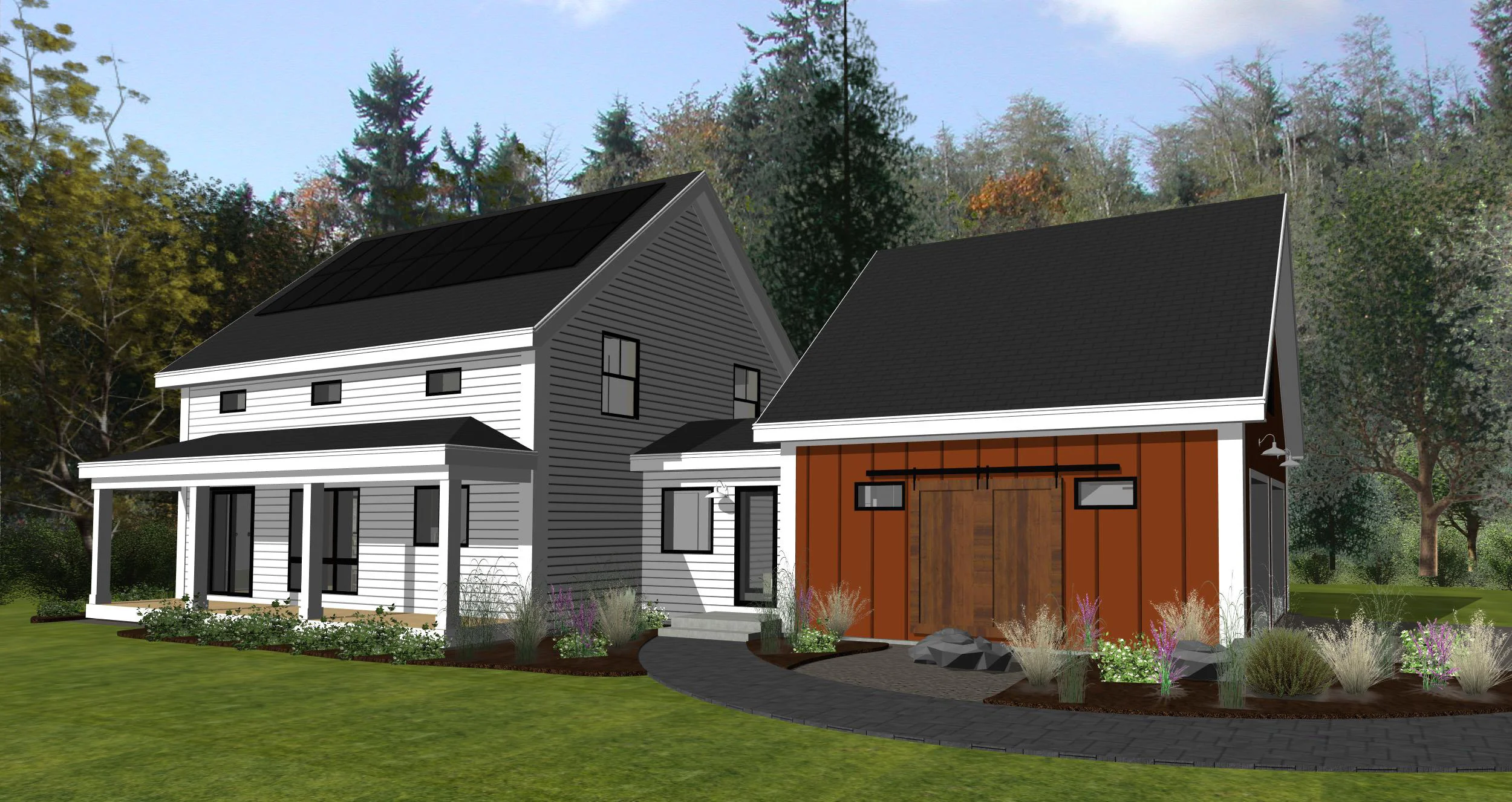 Birch Farmhouse is a little gem. At 1,755 SF this compact family home has 3 bedrooms, 2 baths, and vaulted ceilings on the second floor. Ductless mini splits, 20 solar panels, and 9″ walls make the performance of this home a HERS score of 10. Set up for an additional row of panels and an electric charging station, this home could be zero energy without a hitch.